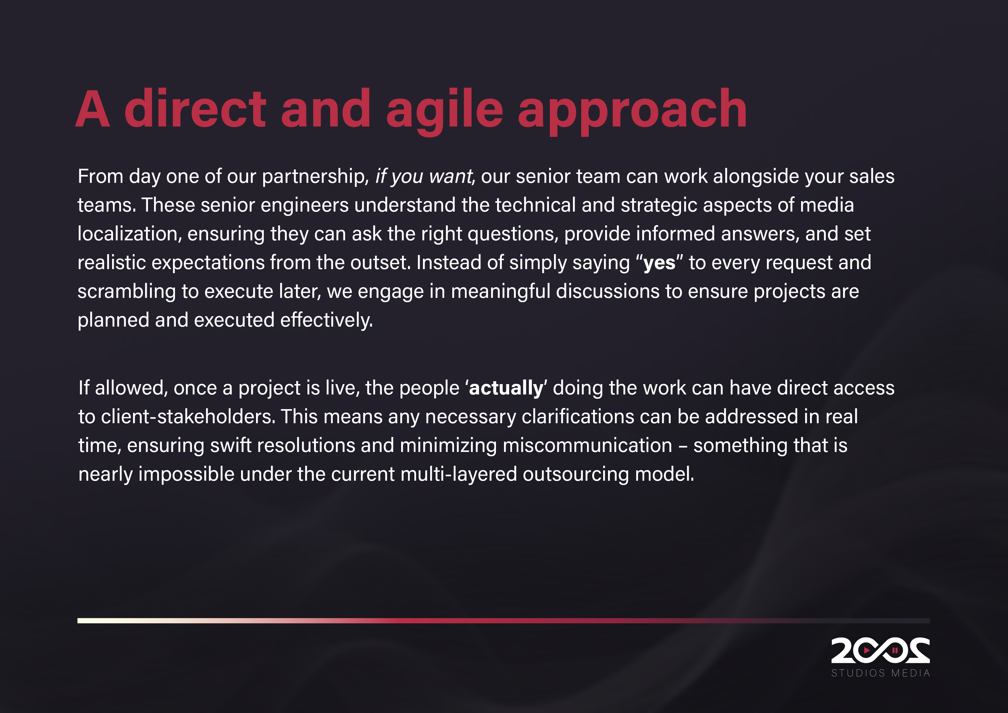 Cutting out multiple outsourcing layers isn’t just a nice idea—it’s the key to faster turnaround localisation and trimming your budget. When your project hops from one vendor to another, delays pile up and costs inflate without adding value. At 2002 Studios Media Ltd, our engineering-led project management puts skilled in-house localisation engineers in charge, speeding up every step from subtitling and dubbing UK projects to motion graphics localisation. Stick around to see why ditching the daisy chain could be the smartest move you make this year. Read more about the pros and cons of outsourcing here.